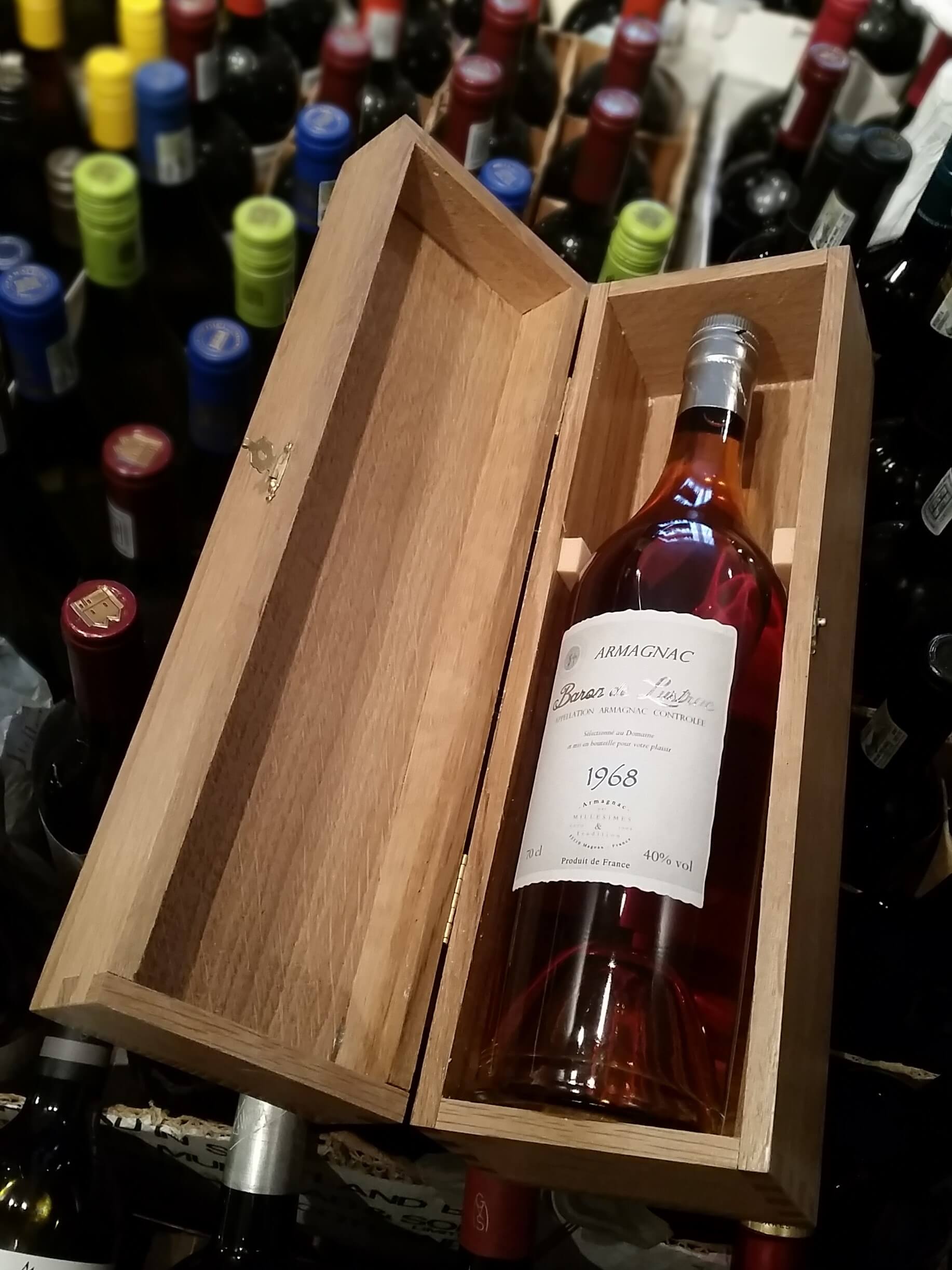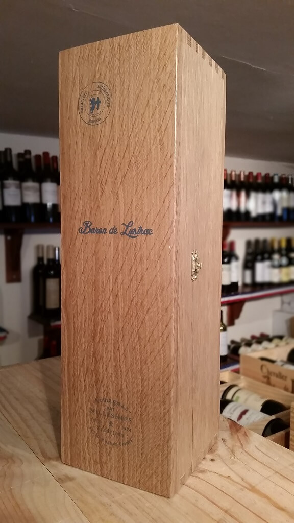 Baron de Lustrac 1968 Vintage Armagnac is presented in an old-fashioned Armagnac bottle and wooden gift box. Only available in very limited quantities.