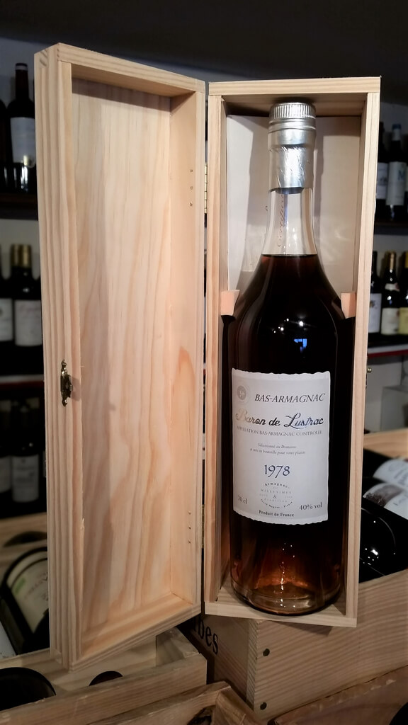 Baron de Lustrac 1978 Vintage Armagnac is presented in an old-fashioned Armagnac bottle and wooden gift box. Only available in very limited quantities.