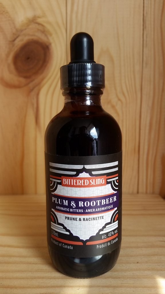 From Bittered Sling, Bittered Sling Plum and Rootbeer Aromatic Bitters is “Ayurvedic blend of barks and roots, with an inherently “hot” palate of warm spices, the Plum & Rootbeer bitters is among one of our best sellers. Bringing out the sweet and savoury notes of ingredients its paired with, even the simple execution of an old fashioned, a Mai Tai or a Tom Collins benefit from this aromatic bitters. A touch of prune plums round out the palate, and help give the bitters its balanced richness. The plums are proudly grown and harvested in BC.”