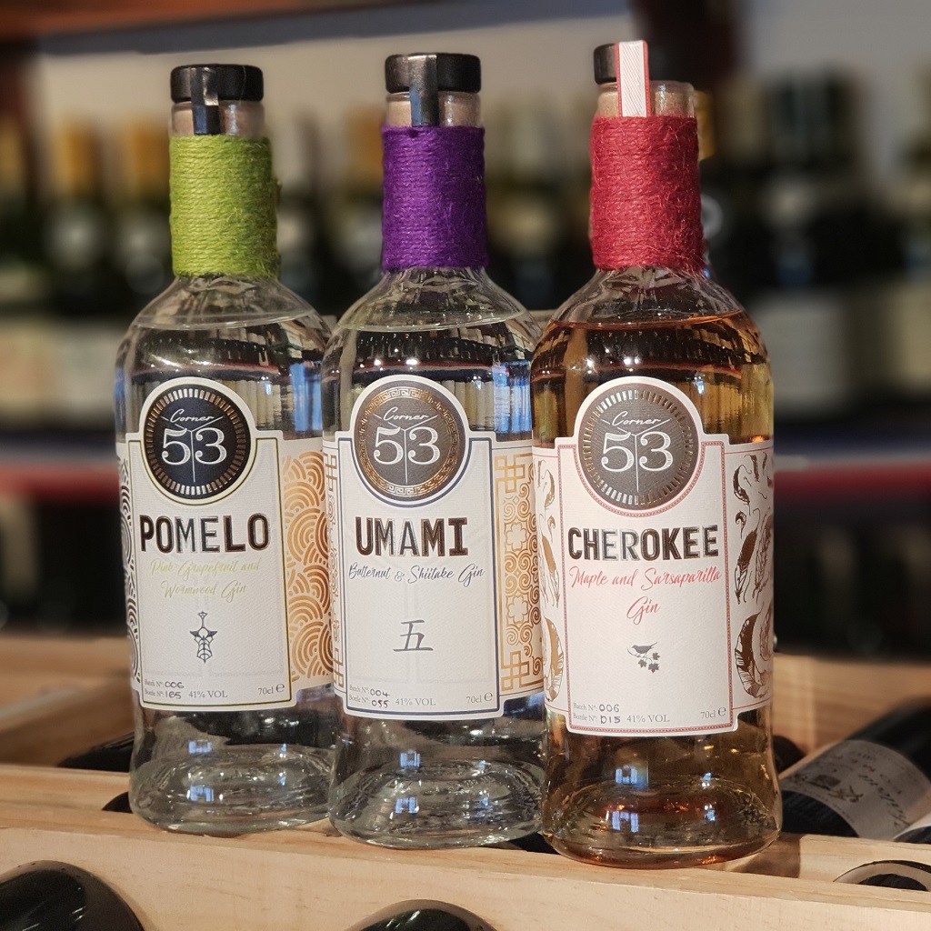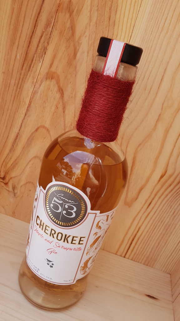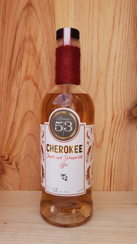 Corner Fifty Three Cherokee Gin is a gin made in Hamphire based around Maple and Sasparilla. It is a sweet smoky gin inspired by Tennessee whisky and the flavours of maple syrup, designed so that it can be drunk on its own over ice as well as in all sorts of cocktails. It forms the core of the Corner Fifty Three gin range alongside the Pomelo and Umami gins.