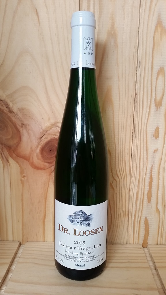 The grapes Dr Loosen Erdener Treppchen Riesling Spatlese are hand selected in the vineyard. The Spätlese designation means that the grapes get an extra week or two of hang time, which helps them develop higher ripeness and deeper flavors. After harvest they undergo cool fermentation in a combination of stainless steel tanks and traditional Fuder barrels. Fermentation is stopped by chilling producing a medium sweet style of wine.