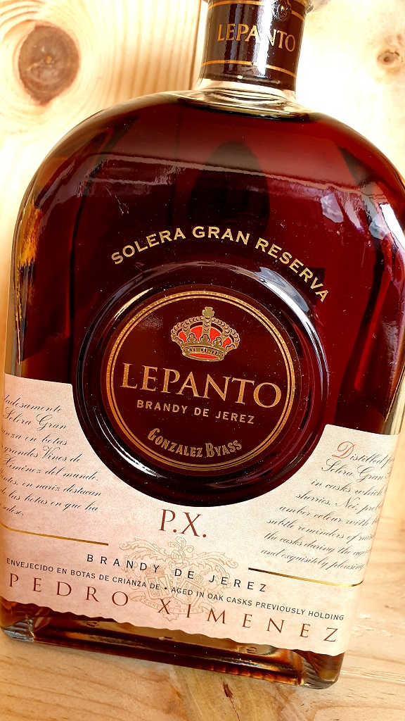 Lepanto PX Solera Gran Reserva is a Brandy de Jerez produced by Sherry producer Gonzales Byass. Lepanto is unusual in that it is the only Brandy de Jerez produced exclusively from the Palomino Fino grape variety, the main grape variety used for Fino and Manzanilla Sherries. It is aged for longer than the Solera Gran Reserva and finished in Pedro Ximenez (PX), rather then Oloroso cask.