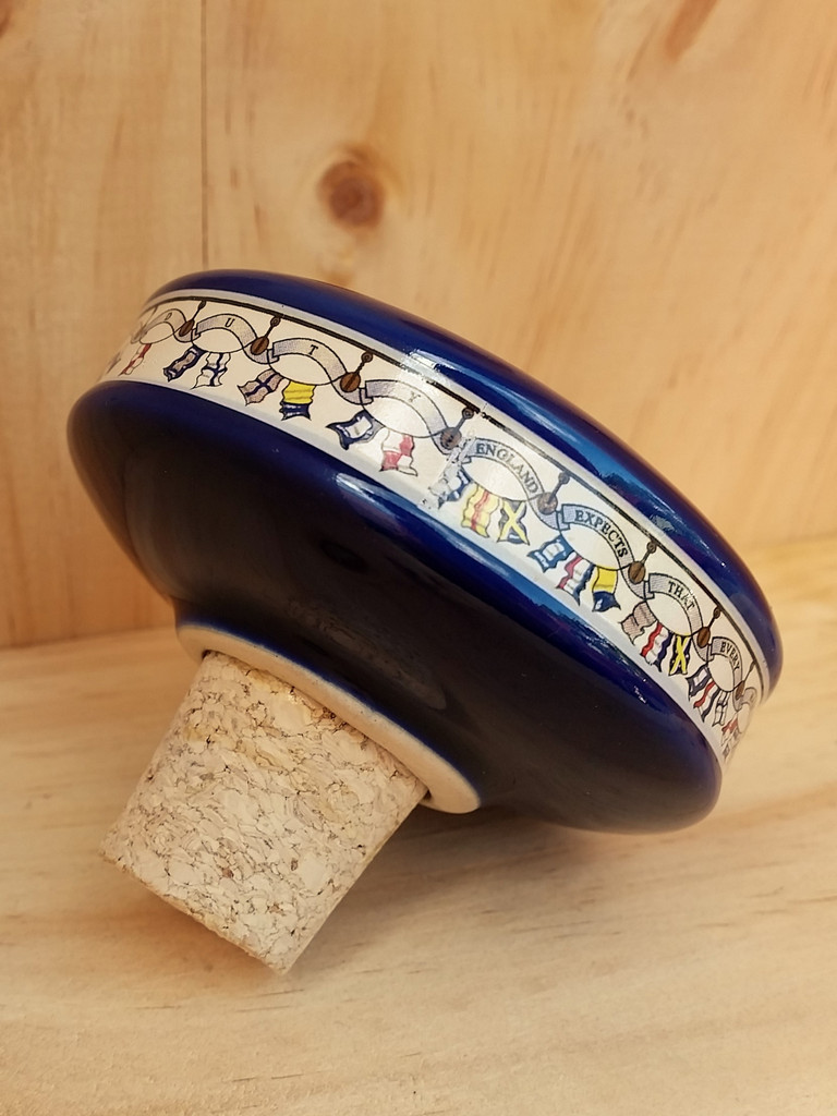 Pussers Rum Trafalgar Bicentenial Ceramic Decanter is decorated with various cameos and paintings. There are cameos of Lord Admiral Nelson, HMS Victory and the Victory Coat of Arms. There is also Pusser’s label and Nelson’s Blood logo. There are also reproductions of paintings of the Battle of the Nile 1978, the Battle of Copenhagen 1801 and the Battle of Trafalgar 1805. There is a ceramic stopper with the killick’s anchor design and a flag decor, the flag signal that set the seal to Nelson’s fame. Just before engaging the enemy at the Battle of Trafalgar, he flew this signal from his flagship Victory: “England expects that every man will do his duty”. The decanter is then finished off with a rope “bumper” around the base made at the Chatham Dockyard, the same ropery that made ropes for HMS Victory.