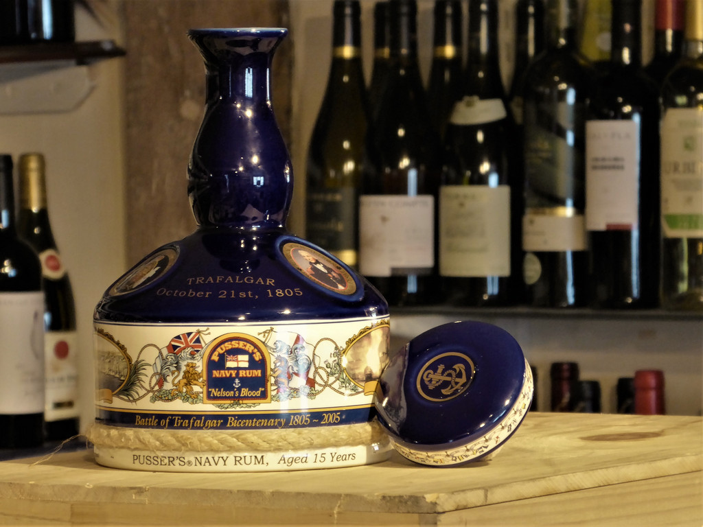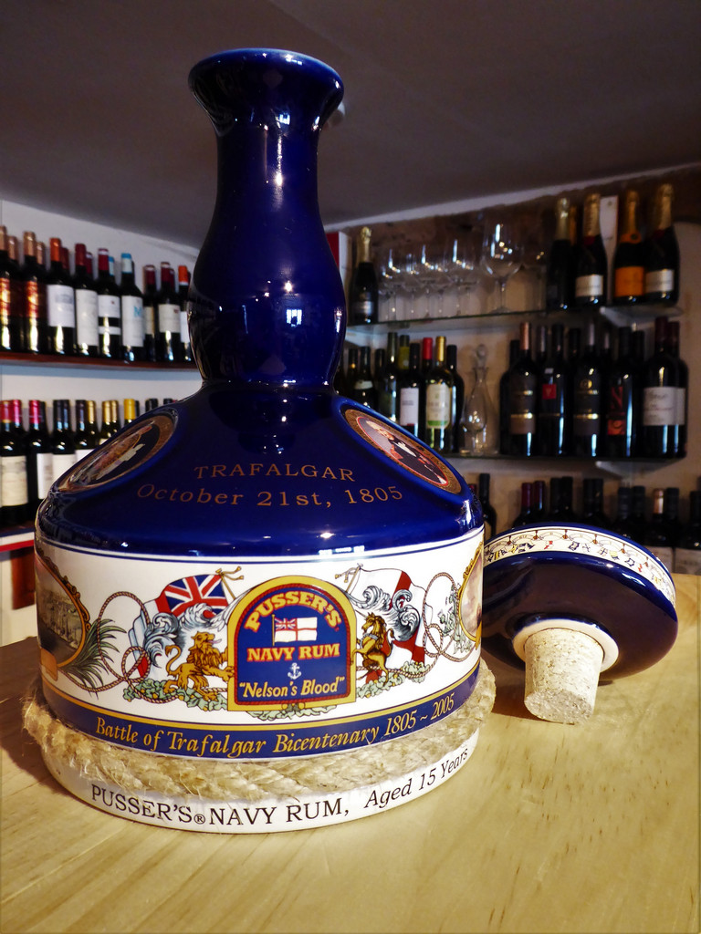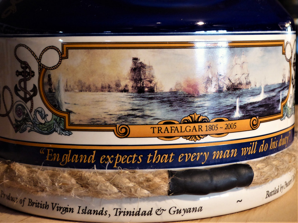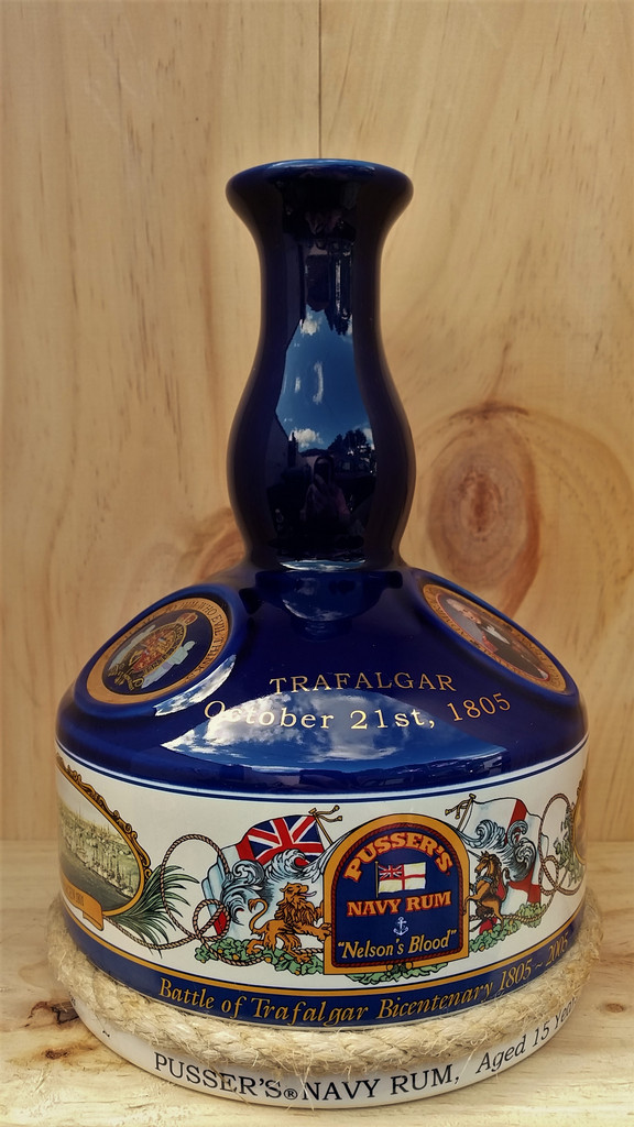 The Pussers Rum Trafalgar Bicentenial Ceramic Decanter has been designed especially to commemorate Nelson and his great victory at Trafalgar. A limited edition of 36,000 units was produced for distribution throughout the world and the decanter is filled with 1 litre of 15 year old Pusser’s Rum bottled at a strength of 47.75%.