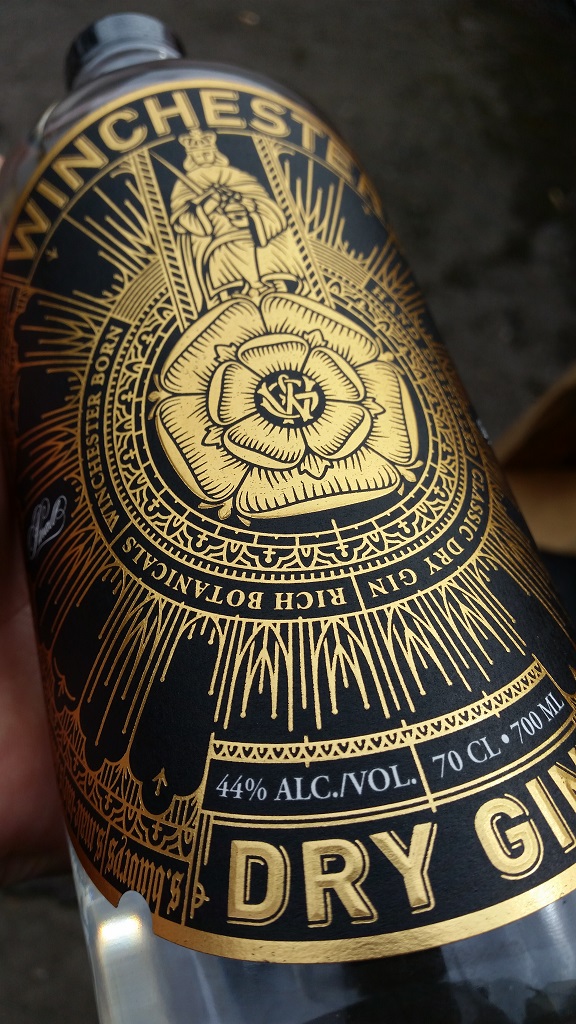 Winchester Distillery ‘Round Table’ Dry Gin was launched on World Gin Day 2017 at Winchester Great Hall. The Great Hall is one of the one of the finest surviving aisled halls of the 13th century (it was part of Winchester Castle) and contains one of the greatest symbols of medieval mythology, King Arthur’s Round Table. The wall hanging table was originally constructed in the 13th century, and repainted in its present form for Henry VIII. Around the edge of the table are the names of King Arthur’s Knights, King Arthur sits at the top of the table and there is a Tudor rose is in the middle. This all features on the label with ornate gold detailing and chiselled branding.