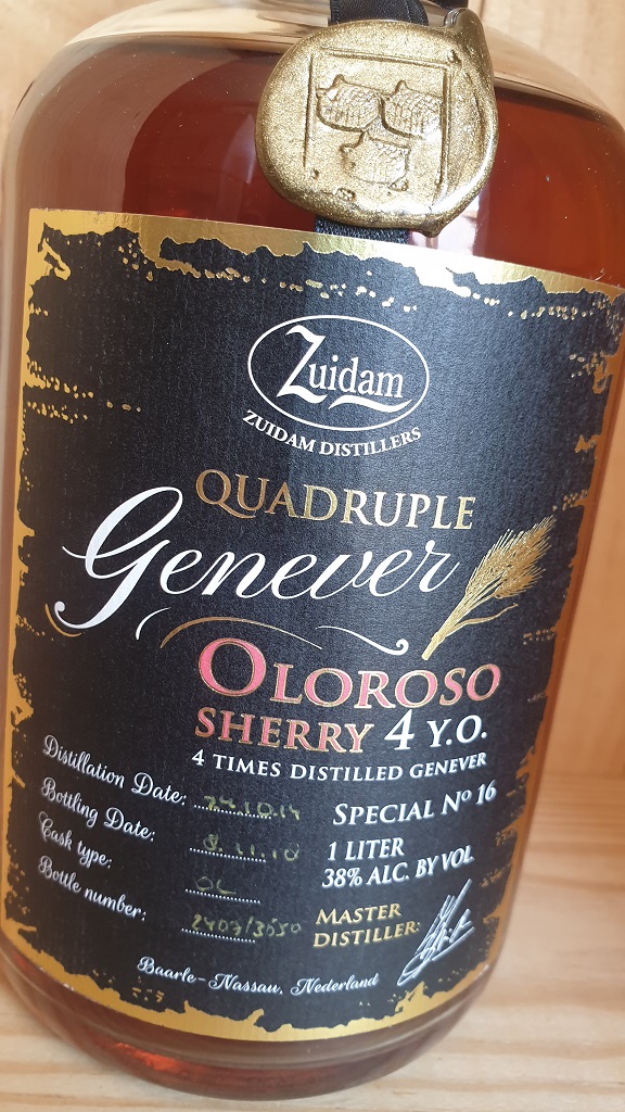 Zuidam Oloroso Sherry Cask 4 Year Old Quadruple Genever is a limited edition bottling. It is called “quadruple” as, unlike most of the other Zuidam Genevers, it is distilled four times rather than three.