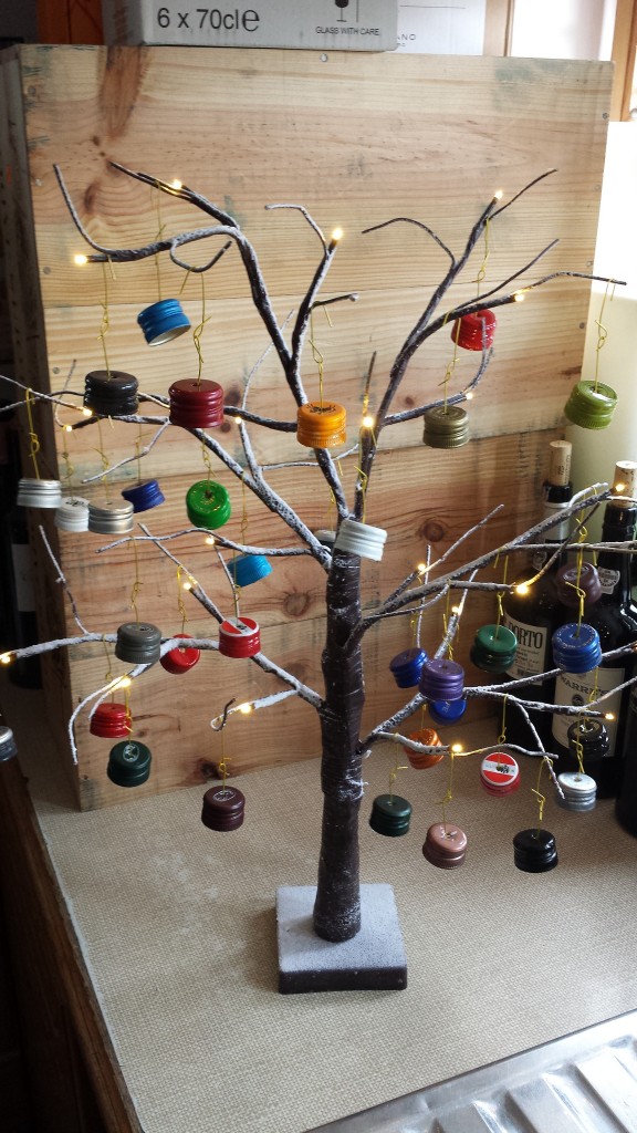 After my little bit of fun with The Stelvin Snowman last year and, with a little bit of time on my hands in early November 2013, before the Christmas rush, I came up with the idea The Stelvin Screwcap Christmas Tree. So armed with a lot of saved up screwcaps (I am not sure what I was saving them for), some Christmas decoration hanging wire and skewer to make some holes I set about making some Stelvin baubles. I did set out with the intention of making a Christmas myself but in the end I chickened out and bought this little twiggy number with some LED lights. Some of you may have seen The Stelvin Christmas Tree lurking in Fareham Wine Cellar shop window for most of December 2013, however, this is the first time I have had a chance to sit down and do a bit of blogging.